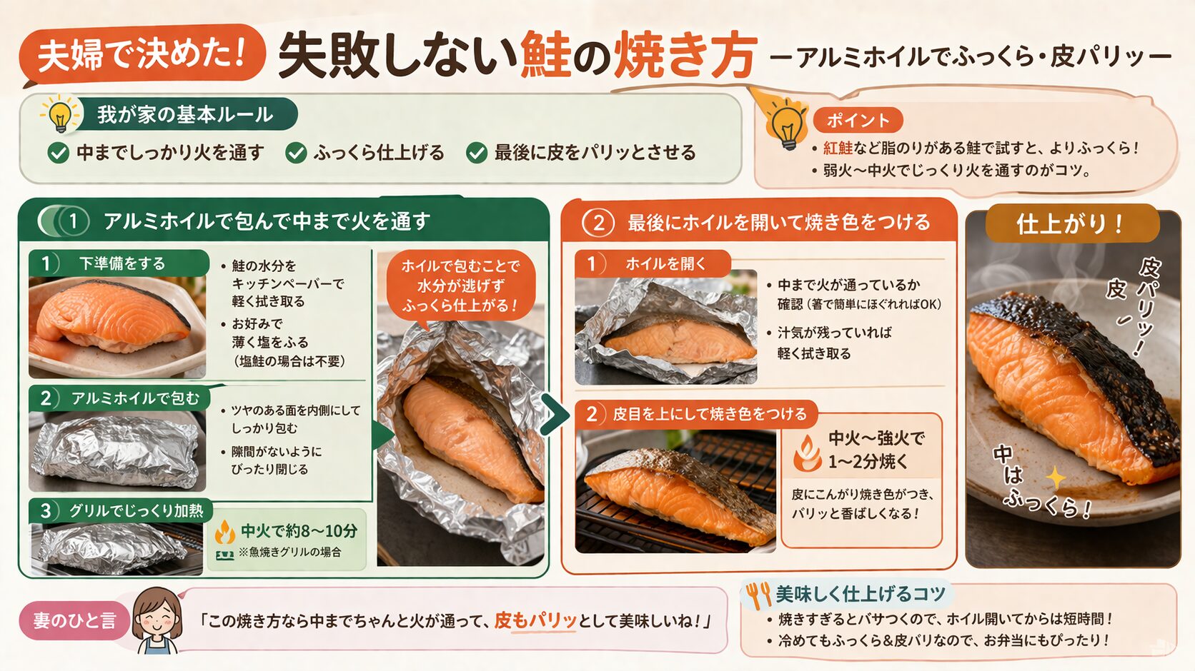 我が家では、妻はしっかり焼けた鮭が好きです。