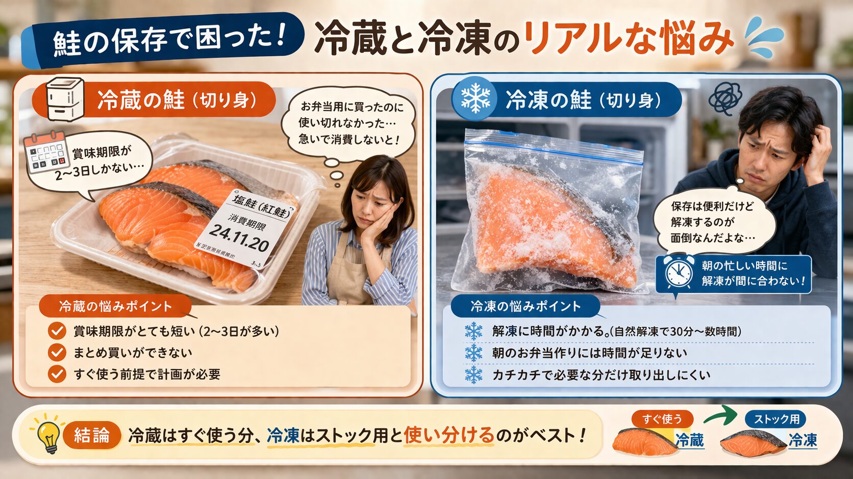 冷蔵の鮭は便利ですが、賞味期限が短いのがデメリットです。